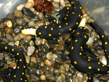 | 総排泄腔が隆起しているオス(手前) 変態上陸後、約3年で確認できた。 |