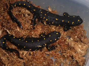 バランツエイモリ (Neurergus strauchii barani) トルコの一部に分布。 NeurergusはN.s.strauchii、N.crocatus、N.kaiseri、N.microspilotusからなり、本種はN.s.strauchiiの亜種。N.s.strauchiiと比べスポットが大きく、少ない。 陸棲のイモリで繁殖期には水棲となる。 飼育下では20℃以下の低温を好みやや乾燥した環境で飼育する。皮膚が濡れているようでは湿度が高すぎる。 餌は何でもよく食べる。ハニーワーム、活赤虫、コオロギワラジムシを好食する。 多少神経質な面もありシェルターは必ず必要で日中はほとんどシェルターから出てこない。 |