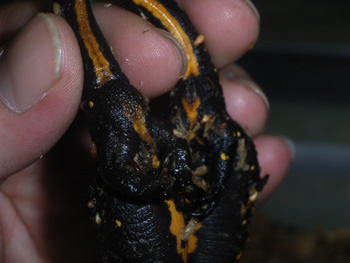腹部 Neurergusの仲間は腹部の模様は蛇行した1本のライン状になっている。 成体では腹部の模様はオレンジ色だが左画像の個体は亜成体の為、まだ黄色。 |