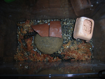 飼育環境 床材に大磯を使い、絞ったミズゴケをマバラにひいてシェルターを入れた簡単なレイアウト。 小さいケースで飼育している為、マメに掃除をしないといけない。週に1度の掃除だが床材を洗い、ミズゴケは全て新しいものと交換する。ミズゴケは長く使うと雑菌を増殖させるようなので早めに交換する。 床材の大磯は表面は乾いているがすぐ下は湿っているぐらいにしている。水場は特には必要ない。現在変態後2年ほどの幼体なので腹部がオレンジになればアクアテラリウムにしようと思う。 |