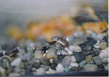ブチイモリ幼生 変態間じかの幼生。5月頃産卵し、9月頃変態する。 幼生形態の時は他の幼生と変わらず、イトメ、冷凍 赤虫などを食べる。 |