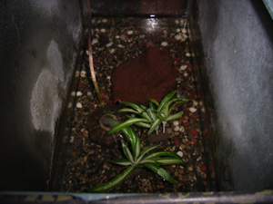 飼育環境 水深10cm程水を入れて石と産卵用の水草(模造品) を入れてあるだけ。 ショップで売っている時点で陸に上陸している場合、 購入後すぐ水に入らないケースが多い。そうなると しばらくアクアテラに水槽をセットし、陸生種を飼うような かたちで飼育することになる。餌は陸生時には 小コオロギ、活赤虫、ハニーワーム小など生餌の 小さいものを与える。 水中生活時はイトメ、冷凍赤虫を食べる。 |