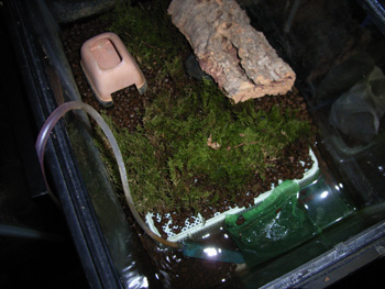 飼育環境 床材は赤玉を使用。水切りザルで底上げし、水深5cm程の水場を作っている。成体は水に溺れるので水場の底にも赤玉を少しひき、活性炭を足場兼水質の浄化になればと思い置いている。清掃は月1度丸洗いする。床材の汚れは感染症を引き起こす原因になるのでフンや餌の残骸は見つけしだいに捨てる。 通常はシェルターに潜んでいる事が多いが、餌のコオロギをばらまくと急いで出てきて追いかけている。協調性の悪い種では無いが45cm水槽では2匹ぐらいがいいと思う。 餌は週に2回で1回はコオロギを20匹ほどばらまき、2回目はハニーワームLを1匹ずつピンセットで与えている。 |