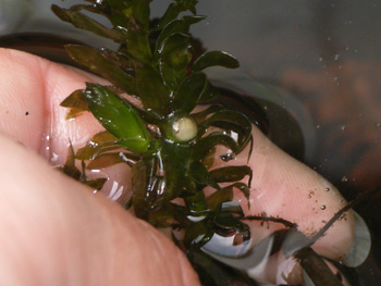 繁殖について 11〜12月頃より求愛行動が確認できるようになる。 産卵させ、種の確認をしたかったので翌2月より 産卵水槽に移動させた。60cm水槽に7分目ほどの 水深をとり、アナカリスを10束ほど入れておく。 産卵用水槽は雨が直接かからない屋外に設置した。 気温の変化や湿度変化により室内よりは誘発しやすい。2週に1度ほど半分の換水をして刺激を与え4月に産卵を確認する事ができた。 今回は60cm水槽を使用したがエアレーションしない為、多数を導入したり春だからと陸形態の個体をいきなり産卵用水槽に入れては死亡する事も考えられるので注意。 |
