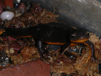 カルフォルニアイモリ(Taricha torosa ) カルフォルニア属は(T.torosa) (T.granulosa)(T.vivularis)の3属からなり、さらにT.torosaには(T.t.torosa、T.t.sierrae、T.t.klauberi)T.granulosaには(T.g.granulosa、T.g.mazamae)の亜種が知られる。 左画像はサメハダイモリ(Taricha granulosa )かもしれない。目がカルフォルニアのほうが小さいと言われるが採集地が分からないとはっきりとは分からない。 T.t.sierraeは過去1度入荷があり、サイズが大きく明るい体色をしていた。T.torosaは南部の個体でイボができる個体郡があるらしく、下顎、腹部側面等にイボが見られる個体が入荷することがある。 森林に生息し、12〜5月頃に10個程の卵の卵塊を池や沼などに産卵する。 |