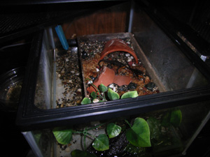 飼育環境 現在45cm水槽を使っているが繁殖させるにはもっと大きいケージがいい。 陸生の為、特に水場は必要無く床材を湿らせる程度でかまわないが繁殖させる場合、地域によって産卵期が違う為、水場を常設しておくと繁殖期に勝手に水に入り繁殖形態になるので水深を深くとるタイミングが掴みやすい。 左画像は平らなプラケースの底に穴をあけ砂利をひき陸地を作っている。掃除はしやすい。 温度管理はそれほど低温にする必要も無いが25℃上限ぐらいが調子いい。蒸れなければ27、8度でも大丈夫だと思う。T.t.sierraeやT.vivularisはもっと低温にしないとダメだろう。 餌はハニーワームを中心にレプトミンを与えている。 |
