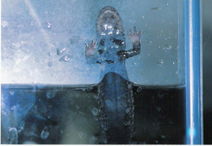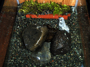 飼育環境 産卵はダスキー種なので陸で雌が孵化するまで守るのだと思うので繁殖を狙うのであれば左画像よりも多く陸地面積をとり、床材も砂利でなく保湿性の良い小粒の赤玉の方が良さそう。 水中部は10cm程水深をとり、石を重ねるように多めに入れる。石の下がシェルターとなり、石の上をコオロギが歩いていると水中から突如襲い掛かり捕食している。 (ジョーズが人を襲うシーンのようだ) 丈夫なサラマンダーだが山地渓流に生息する為、低温飼育が必要。23℃ほどを上限にし必ずフィルタリングする。水質の悪化には弱い。 |