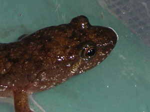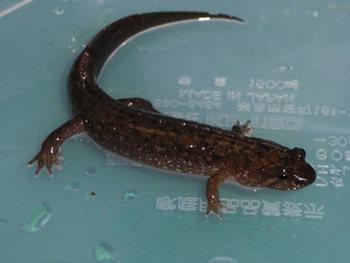 ブラックベリーサラマンダー (Desmognothus quadramaculotus) アパラチア山脈周辺の渓流に生息する。 ダスキーサラマンダーの仲間ではかなり大型の種で水棲傾向が強い。 動きは非常に素早く、跳ねるように動き回り貧欲に餌を追いかけ捕食する。よく動くものに反応が強いのでコオロギを中心に動きのいい昆虫類を与える。 画像の個体は亜成体で名前の由来である黒腹では無い。ある程度育つと黒くなるようだ。典型的な成体は目の周辺から体の側面にかけて白いスポットが並ぶ。 ダスキーの仲間は陸生傾向が強いほど小型化する。 |