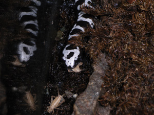 雌雄は総排泄腔で確認できる。他種と同じく雄は腫れるので分かるが非繁殖期以外はチョット分からないときもある。雌は体色が薄い・・とかの 判別法も聞いたことがあるが、体色ではあてにならない。 繁殖期は秋で朽木下、土中の窪み等に産卵し、雌は孵化するまでその場に留まる。孵化した幼生は雨に流され沼等で成長するようだ。 |