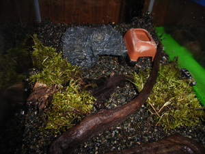 飼育環境 水には入らないので水入れは無くても大丈夫だが床材がちょっと湿る程度にしているので乾燥しすぎには注意したほうがいい。私は床材に砂利をひいているが産卵させるには目が粗く、重いので適さないようだ。 細かいセラミック材や細かい焼赤玉が湿度管理も産卵させるにも向いているようだ。土やヤシガラマットもいいのだけれど、もぐりっぱなしで観察は出来なくなる。 砂利は多少高低差をつけてひき、湿り具合を変えているが冷房時はすぐ乾燥してしまうので中間あたりが乾いてきたら給水している。日々のチェックが必要だ。コケは湿度確保用に多少入れた方がいい。 |