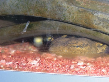 マッドパピー頭部 大きな頭部と外鰓をもつ。頭が大きいだけあって、大きな獲物でも深夜は襲いかかる。 中学生のころアホロートルの水槽が割れて急遽一緒に入れたことがある。20cm近いアダルトの個体だったので平気だろうと思ったのだが次の日にはしっかりと喰われた。 餌は馴れれば冷凍エビに餌付くが最初は金魚がいいと思う徐々に金魚を口元に近づけると食べるようにしていけば冷凍エビでも口元で揺らせば食べるようになる。金魚の単食はバランス的にも病気が感染することからも止めたほうがいい。私はエビを中心に活ドジョウなどを与えている。 |