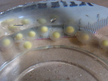 産卵された卵は29個 11年の冬に、♂は尾を振り、求愛していたので 期待はあったが、残念ながら未受精卵。 |