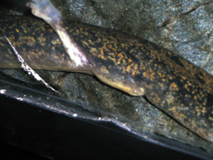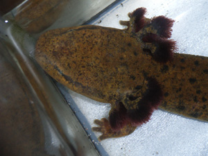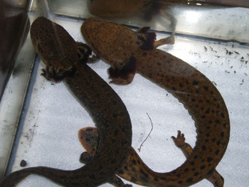 マッドパピー(Necturus maculosus) 左(雄) 右(雌) 大型の水棲種でカナダからアメリカミシシッピー州に分布する。 おとなしいイメージで紹介される事も多いが、意外と活発で夜行性だが昼間でもシェルターより出てうろついている事も多い。餌を入れると日中でも餌を追って(ゆっくり)近づき鼻先まで餌が近づくとズボっと水ごと吸い込む。 夜はさらに活発になり同種での噛み合いも多いので複数飼育するならば大きめの水槽でシェルターも多く入れた方がいい。目安は60cm水槽ならば単独飼育になるだろう。 生息環境は池や川など様々らしいが、おそらく共通して言えるのは冷涼できれいな水域なのだろう。水質の汚染や急な変化にはすごく弱く、すぐに全身にカビがはえて死亡するので注意。 |