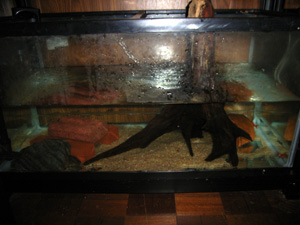 飼育環境 90cmを使用。2〜3匹は収納できると思う。私は本種の飼育のポイントは水換えと水温管理だと思う。絶対に水の総取替えはしてはいけない。水の取替えは月1で三分の一でいいが水質変化に敏感なので少しづつ新しい水を落としている。小さい水槽ではエアーチューブなどでポトポト水を落としたほうが無難。水温は最高23度ほどが目安。それより高くても大丈夫だが、水温が高いとちょっと水質が悪くなるとすぐ病気になったり突然死する。冷却装置が必要と言っていい種だろう。夏の高温には耐えられない。 この水槽には外部フィルターを使用。シェルターはレンガと流木を入れているが、もっと大きい石を多数入れた方がいいと思う。 |