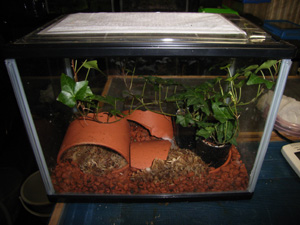 飼育環境 熱帯圏のサラマンダーの為、寒さにはあまり強くは無い。15度を下回ると動きがにぶくなり餌を食べなくなるので冬は加温が必要になる。夏は20度前後でも問題なく採餌している。26,7度は問題なさそうだが夏の室内は思いのほか高温で蒸れ易いので風通しのよい涼しい所に置くか、ファンを回した方がよさそうだ。 適温は20℃〜26℃ぐらいだと思う。湿度は必要だが多湿は嫌うのでビショビショにしてはダメ。私は床材の赤玉や植物の土が湿っている程度を保つようにしてる。 脱走するので蓋は必ず必要。私は蓋を半田ごてで焼き切り、流し用の排水溝水切りフィルターで通気を確保している。 |