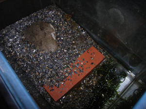 飼育環境 45cm水槽で飼育しており3分の1程を水場にしている。 陸にはミズゴケ等は入れていない。水位を砂利の表面より少し下げる程度に調節して砂利表面が乾くようにしている。 導入直後はシェルターを設置したほうがいい。 3月頃から入水し5cm程度の水深でも結構産卵している。様子をみて水草に卵があれば水深を深くしてあげれば100卵近く産卵する。孵化し上陸した幼体は小さいので飼育するのが大変。 |