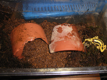 飼育1例 06年現在、雌個体がやや小さい為、雌雄分けて 飼育している。 雌は鰓の無い幼体を産む事が知られているが 外鰓のある幼生、変態の近い幼生を産んだり する事もあるので、繁殖用にレイアウトするならば 水場はあった方がいいと思う。 基本的には他の亜種同様、低温と蒸れ、清潔を キープすれば飼育は問題ない。 |