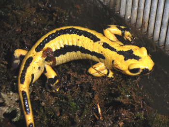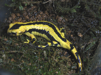 ピレネーファイアーサラマンダー (Salamandra salamandra fastuosa) スペイン北部〜ピレネー山脈に分布。 レモンイエローのストライプが綺麗な小型亜種。 餌はコオロギやハニーワーム等、定番活餌をよく食べ、 それほど餌に困る種ではないが、やはり高温には弱く 適温は20℃前後だと思う。 |