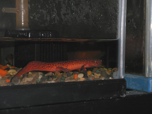 水中で散歩 昼間は完全に隠れてまず姿は見せてくれない。パトロン有尾館の個体は水中5割、陸4割ぐらいで生活している。これほど水中に依存する個体ばかりではない。 夜になると水中を急ぎ足でタカタカ歩いているのをよく見かける。 |