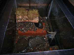 飼育環境 水陸半々のアクアテラで水深は5、6cmぐらい。水中ポンプで水面とシェルターのコルクに水を送っている。陸地にはポタポタ水が垂れる程度だが砂利の上に苔をひいていないので湿度保持と洗浄効果を期待している。苔をひいてもいいが、まめに取り替えよう。 冷涼な環境と湿度が必要で適温は15度から18度ほど最高でも20度ほどにしたい。冷却装置は必須だ。 今のところ1匹の飼育で繁殖を視野にいれたレイアウトはしていない。4〜5匹いるならば60cm以上の水槽に移して水深も15cmほどとった方がいいだろう。 画像は45cm水槽なので1ペアぐらいまでが限界だと思う。 |