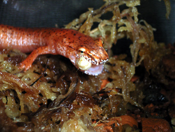 ノーザンスプリングサラマンダー (Gyrinophilus porphyriticus porphyriticus ) 一番よく見かけるスプリングサラマンダー。 かなり大きくなる種だが体色は鮮やかな赤ではなく くすんだ色のものが多い。亜成体では赤を帯びる。 こちらはコオロギを好んで食べている。 |