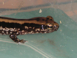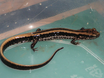 スリーラインサラマンダー(Eurycea guttolineata ) アメリカ ルイジアナ、テネシー州等に分布 細い体つきにしては丈夫な種で餌食いもよく、餌はコオロギ、ワラジ等の虫系から活赤虫、ハニーワームと動くものにはすぐに餌付く。シェルターに隠れていればピンセットからでも食べるが基本的に臆病なので人工飼料は餌付かない。 温度は低温を好むので25度以上にはしない。温度が高いとか汚れた環境だと長生きしないので注意。 湿度もかなり必要とするためアクアテラかコケリウムで出来れば陸上にも一部ポトポト水が滴るようにするといい。床材がビチョビチョよりも大気中の湿度が高い方を好むようだ。 |
