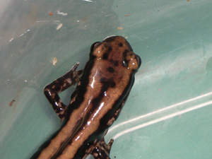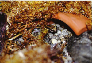 飼育環境 画像は45cm水槽だが繁殖を狙うなら60cmを使った方がいい。2分の1を水場にする。水深は5cm程でも産卵可能 過去に4回の産卵経験があるが11月頃にまず雄が入水し1月ほど遅れて雌も入水する。産卵は12月、2月に1度づつ3月に2度行われたが12月に産卵されたものは低温の期間が長い為成長がひどく遅かった。面白い事に雌雄ともに春まで水中に留まる。産まれた卵は何かに産み付けるのではなく水底の砂利に1粒づつ70〜100個ほどバラまくように産む。 孵化した幼生は細長く、成長していくと尾を直角に曲げたりS字型に曲げたりと変わった動きをする。初秋には変態する |