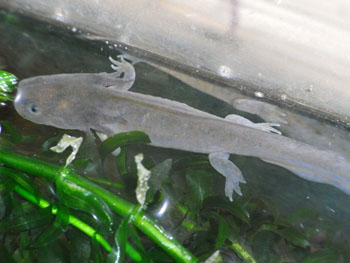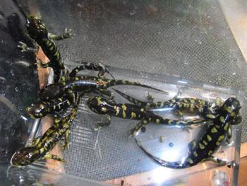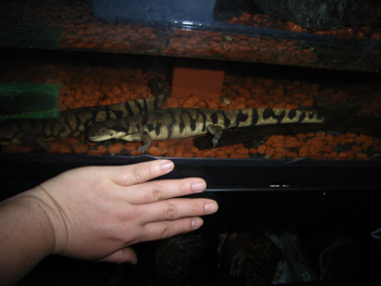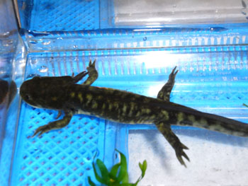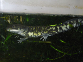 冬は水中生活 通常は陸生のタイガーサラマンダーだが冬になると水中で過ごすことが多くなる。 繁殖は経験が無いが水中生活時に換水してヒーターで温度をあげてやれば産卵させることも可能だと思う。 繁殖は温度変化だけでなくタイガーの場合、サイズが大きいので全長の2倍の水深をとるだけでも50センチは必要だし、求愛行動を円滑に行わせるのに水槽の大きさも大型のものが必要だろう。実際に繁殖を成功させている人は 120〜150cmの大型水槽を使っているようだ。 |