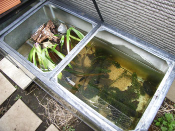 2008年 3月30日 産卵を確認する。 水温12度 おそらく3月27日に産卵したものと思われる。 画像は産卵用に使用した水槽。90x45.水深約30cm。 何に好んで産卵するか不明だった為、陸から垂れ下がる植物、水草、石、流木、ビニール紐と多様な産卵床を用意した。 通常は陸上生活をするサラマンダーだが気温が下がる冬には水中にいるようになると上記で述べたが、08年は水中へ移行した個体♂1♀2を2月中旬に野外繁殖水槽へ移した。 繁殖行動は見る事が出来なかったが、産卵直前(産卵時?)水底を活発に動き回る様子はうかがえた。繁殖はおそらく他の有尾類と同じく水温、水質の変化がリリーサーとなるのだと思う。 水中に適応した個体は、いつもの餌くれモードでは無く、人影に怯えて逃げ回り、口元に餌を差し出しても食べない為、一応活赤虫をばら撒いておいた。 (あまり食べた痕跡無し) |