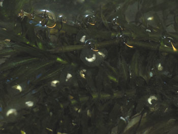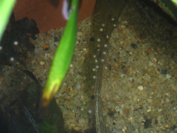 | 産卵された卵は陸上から垂らした植物以外の全ての産卵床に産卵した。 有る程度固まって産卵されているものもあれば、バラバラに産みつけられたものもある。 おそらく一点で産卵して、卵をばら撒きながら移動してまた1点で産むという事ではないかと思う。 気が付いた事は30cmの水深で上部には産卵が少ない事。 主に水底近くに集中している。 |