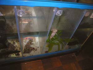 飼育環境 60cm水槽ならば1ペアぐらいが適当。あまり個体がふれる機会が多いと手足を食われる事が多くなる。食われても再生するが、あまり頻繁だと再生に栄養をとられ成長が遅くなったり、最悪弱って死ぬ。 普段はセパレーターで個体ごとに分け、総排泄腔が肥大してくれば雌雄を一緒にして1月ほどすれば受精しているのでその後はまた分けてしまう。 上部フィルターでろ過しているが結構水を汚すので月1で半分ぐらい換水している。 餌はメダカ、赤虫など動くものに敏感に反応するが、ナマズ用の人工飼料(キャット)などで十分だ。 よく水面に浮いたまま沈まないという人がいますが水を換えて少し温度を下げてやるとだいたい直ります。 |